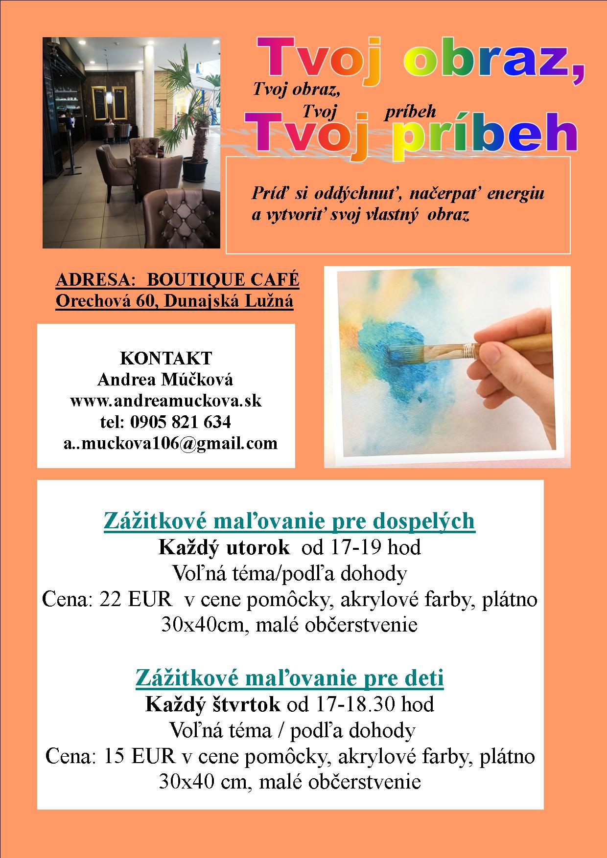 Páči sa Vám maľba inšpirovaná obrázkom alebo maľba vlastnej predstavy? Tématika v tomto týždni bude zameraná na hranie sa s farebnosťou, miešaním farieb, a kompozíciou. Maľuje sa na maliarskom stojanie a svoje dielo si zoberiete domov.. Vytvárate si svoj originál, na ktorom sa prejaví Vaša kreativita. Budeme mať dostatok priestoru na individuálny priestor a tvorivú náladu. Nemusíš mať žiadne predošlé skúsenosti, stačí chuť tvoriť a oddýchnuť si. Priniesť si môžete svoj obrázok alebo si vyberiete námet u mňa.